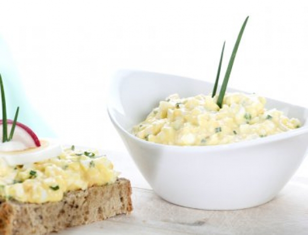 PRIPRAVA: Zme??amo margarino in skuto. Spasiramo kuhana jajca in jih dodamo. Začinimo po okusu.