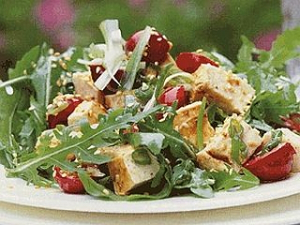 čSestavine: 40 dag pi??čančjega fileja, 40 dag drobnega paradi??nika, 20 dag me??ane zelene solate, 1 dl solatne majoneze, 10 v olju vlo??enih inčunovih filejev, ??lica kaper, olivno olje, ro??marin, sol.