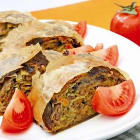 Sestavine: 1 paket listnatega testa, 500 g mletega mesa (govedine in svinjine), 2 srednje velika jajčevca, 1 jajce, 1 čebula, strok česna, 250 ml paradi??nikove mezge, 2 ??lici olja, sol, poper, bazilika.