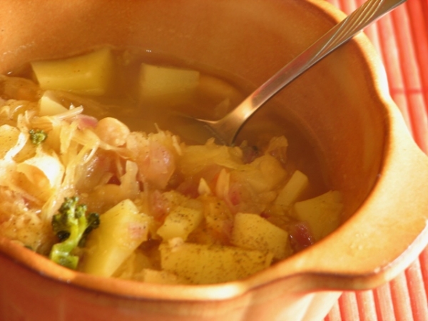 Na olju popra??imo nasekljano čebulo, dodamo krompir, korenje in ju??no osnovo.
