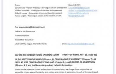 NORVEŠKA in DANSKA se prav tako pridružujeta pritožbi na haaškem kazenskem sodišču - zaradi storitve zločinov proti človeštvu (28.05.2021) | newsexchange ... To je dokument, ki ga je delila odvetnica Ruth Machnes Suchovolsky, ki ji jo je poslal eden od odvetnikov, ki je vložil pritožbo./div Podobno