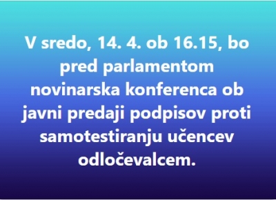 V sredo, 14. 4. ob 16.15, bo pred parlamentom novinarska konferenca ob javni predaji podpisov proti samotestiranju učencev odločevalcem. (12.04.2021) | newsexchange ... /div ... | Podobno