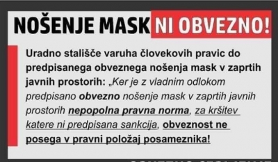 NOŠENJE MASK V JAVNIH ZAPRTIH PROSTORIH JE ZAKONSKO NEOBVEZNO, ZATOREJ NE POSNEMAJTE VEČINE! (27.03.2021) | newsexchange ... Odloki o nošenju mask v zaprtih prostorih (vlada RS) spada pod "druge posebne ukrepe" zakona ZNB, člen 10, točka devet. zakon ZNB pa ne predpisuje kazni za "druge posebne ukrepe", sprejete naknadno, ... | Podobno