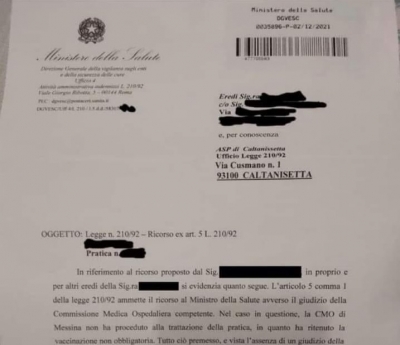 EU-SEARCH NOVICE | Italija: Po obdukcijsko dokazani smrti zaradi cepljenja proti Covidu dediči zahtevajo odškodnino po zakonu 210/92, na kar ministrstvo odgovarja takole ...