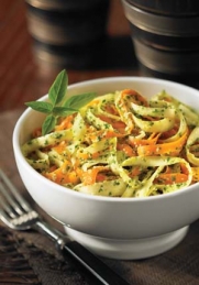 Korenje ostrgamo in vzdolžno nastrgamo na zelo tanke rezine. česen in ostrgan ingver drobno nasekljamo. V oplasteni ponvi popražimo sezam. Rezance skuhamo v kropu. Na olju in maslu dve minuti pražimo česen in ingver. Dodamo korenje in pražimo p