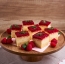 Kocke sestavljene iz krhkega testa, kreme iz kisle smetane in vanilijevega pudinga ter preliva iz malin. Ta krema mi je zelo všeč, saj pudinga predhodno ni potrebno kuhati. Preliv lahko pripravimo tudi iz katerega drugega sadja, meni so maline najbolj ...