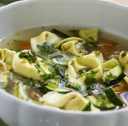 – 2 žlici oljčnega olja – 250 g piščančjega mesa (bedra brez kosti in kože) – 2 stroka česna, manjša čebula, 3 korenčki – sol, poper, timijan, origano, 2 lista lovorja – 1,5 l piščančje jušne osnove ali vode – 250 g tortelinov – 2 bučki, peteršilj, sok pol limone