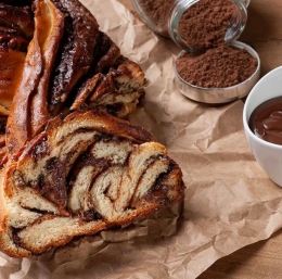 Vzhajano testo razvaljamo, premažemo z nutello. Zvitek prerežemo na polovico po dolgem, ne do konca – na vrhu ga ne prerežemo. Trakova prepletemo enega čez drugega.