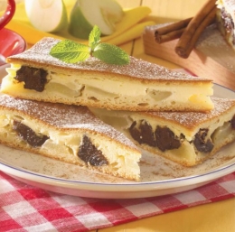 Polovico testa razporedimo po namaščenem in z moko potresenem pekaču, pustimo vzhajati približno 20 minut. Nato ga posujemo s slivami, koščki jabolk, namažemo s skutno mešanico in obložimo s preostalim testom.