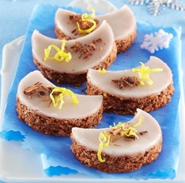 Ko se pečeno testo ohladi do mlačnega, ga po vrhu prelijemo s pripravljenim prelivom in pustimo, da se strdi. Iz testa s pomočjo posebnega modelčka ali kozarca izrežemo lunice, ki jih polagamo na servirni krožnik ali pladenj. Poljubno jih okrasimo (limonina lupinica, nastrgana čokolada, mrvice, perlice) in postrežemo.