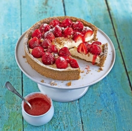 Sestavine za nadev stepemo z električnim mešalnikom, da dobimo gosto zmes. Z žlico jo previdno razporedimo po piškotni osnovi in jo obložimo s 25 jagodami. V hladilniku jo hladimo vsaj 2 uri.