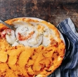 160 g lososovega fileja brez kože 1 beljak ½ lončka kisle smetane 2 žlici zdrobljenega ledu sol poper 330 g fileja poljubne bele ribe brez kože 1 žlička kurkume nekaj vejic peteršilja