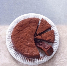 Beljaka stepemo v trd sneg in ga nežno vmešamo v maso. Maso damo v model in jo pečemo 20 do 25 minut, da se naredi rahla skorjica. Kolač ohladimo v modlu – biskvit med hlajenjem upade, skorjica pa popoka. Kolač vzamemo iz modla, ga posipamo s kakavom in postrežemo s smetano ali sladoledom.