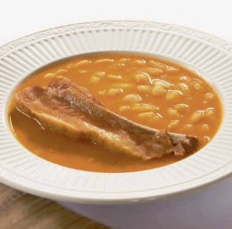 400 g belega fižola 400 g bele čebule 400 g prekajenih rebrc 8 strokov česna 1 lovorov list sol nekaj zrn popra 2 žlički sladke mlete paprike 1 žlička paradižnikove mezge feferon ali ostra mleta paprika (po želji) 1 poravnana žlica moke