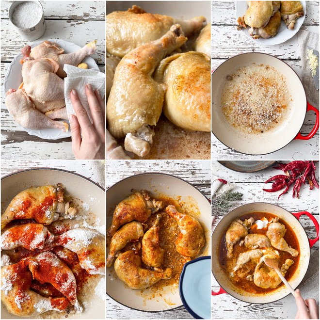 4–6 piščančjih stegen 1 čebula 1–2 stroka česna 2 dobri žlici kisle smetane žlica mlete rdeče paprike zvrhana žlica moke žlička majarona, lovorov list žlica svinjske masti žlička paradižnikovega koncentrata sol, sveže mlet poper valvice