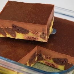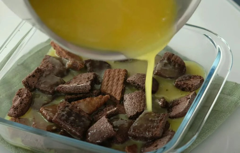 Preko njih polijemo pomarančno zmes in damo v hladilnik. V lonec damo kakav, sladkor, agar agar in mleko. Dobro premešamo in kuhamo 5 minut. Ko je zmes gotova, jo prelijemo čez prvo plast in postavimo nazaj v hladilnik, dokler se ne strdi.