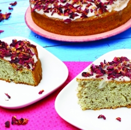 Testo stresemo v pekač, ga damo v ogreto pečico in pečemo približno 40 minut. Pečen kolač preložimo na mrežico in pustimo, da se ohladi. Sladkor v prahu in žlico limoninega soka gladko zmešamo in zlijemo ali namažemo na kolač ter nazadnje potresemo s cvetnimi lističi vrtnic.