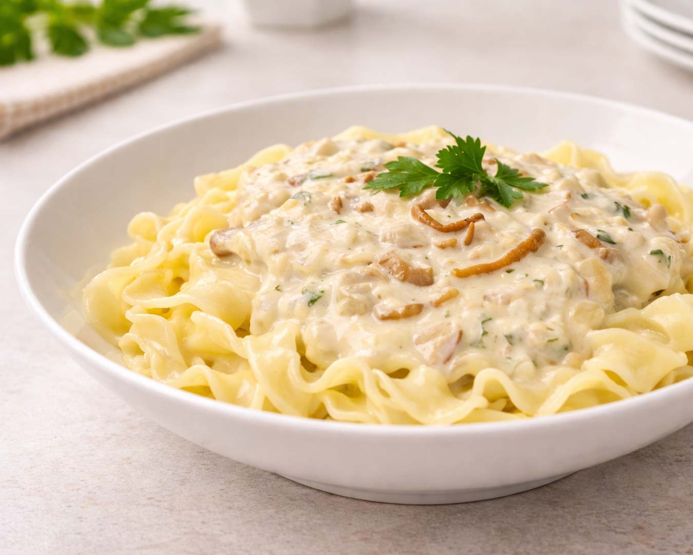 Testenine v kremni sirovi omaki z gobami so hitro pripravljeno, nasitno kosilo, ki z bogatim okusom navduši v vsakem letnem času.