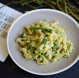 – šopek divjih špargljev – cvet ali dva brokolija – mlada čebula – česen – cel čili – rastlinska smetana za kuhanje (uporabili smo kokosovo) – nežne testenine (široki rezanci ali podobno) – sol in poper – oljčno olje
