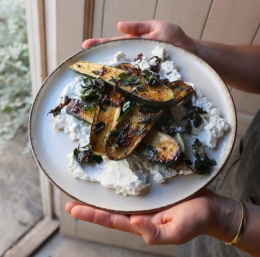 5. Pečene bučke položimo na podlago iz labneha in fete ter postrežemo.