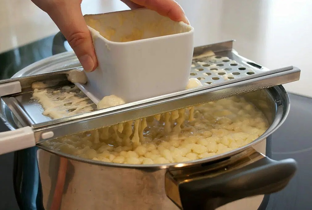 2 V velikem loncu zavremo vodo, ki jo rahlo osolimo. Vre naj na zmerni temperaturi. Pričnemo z vlivanjem testa v krop. Pomagamo si s cedilom, ki ima široke luknje, ali kar s strgalnikom za grobo rezanje, kar je še lažje.
