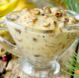4 Zalijemo s sladko smetano, primešamo še kislo smetano in na nizki temperaturi jurčke dušimo še 5 -7 minut, da se omako zgosti.