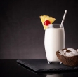 4-5 majših kock ledu 12,5 cl ananasovega soka 6 cl kokosove smetane 3 cl sladke smetane 3 cl sveže iztisnjenega limetinega soka rezina sveže narezanega ananasa in kandirana češnja za okras