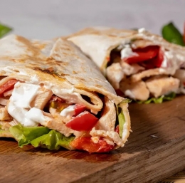 500 g piščančjega mesa brez kože in kosti, priporočamo prsi in bedra 1 limona – sok 1 drobno nasekljana čebula 2 stroka nasekljanega česna 0,2 dl oljčnega olja 1 žlička mešanice začimb (curry, čili v prahu, mleti koriander) 1 žlička soli 1/2 žličke popra 1 manjša glava zelene solate 2 paradižnika 1 šopek sveže bazilike 2 dl jogurtove omake 4 jufke ali tortilje