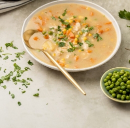 Juho postavimo nazaj na štedilnik in vanjo dodamo narezan korenček, grah, koruzo, sol in poper. Vse skupaj zavremo in kuhamo naslednjih 15 minut oz. dokler se zelen ne zmehča.