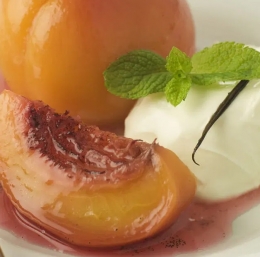 V posodo, ki je dovolj velika za 4 breskve, vlijemo vino in med, dodamo še vaniljev strok, ki ga prerežemo na pol. Pri zmerni temperaturi segrevamo, da se med stopi. V lonec damo breskve, pokrijemo in jih kuhamo 15-20 minut. Breskve morajo biti skuhane, vendar še vedno čvrste. Vmes jih parkrat obrnemo in polijemo s tekočino, v kateri se kuhajo.