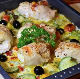 4 piščančja prsa (brez kosti in kože), 1 srednje velika bučka, 1 rdeča paprika, 100 g črnih oliv (brez koščic), 100 g češnjevih paradižnikov, 50 g brokolija, 200 ml smetane za kuhanje, 2 jajci, 50 g parmezana (naribanega), svež peteršilj (za okras), sol, poper, origano, paprika v prahu, olivno olje.