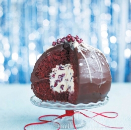 175 g zelo zmehčanega masla 200 g moke 200 g svetlo rjavega sladkorja 4 velika jajca 2 žlici kakava 1 žlička sode bikarbone 1 ½ žličke pecilnega praška ščepec soli 75 g pinjenca 2 žlički vaniljeve arome 20 g rdeče barve za živila (primerne za peko) 2 žlici belega vinskega kisa maslo in moka za model suhe brusnice za okras sladke mrvice in jedilne bleščice za okras (po želji)
