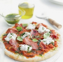 2 testeni osnovi za pico 4 žlice paradižnikove omake 2 rezini šunke 250 g albuminske skute (rikote) 1 žlica svežega pesta listi bazilike