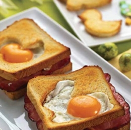 V ponvi ocvremo jajca na oko. Gotove rezine toasta vzamemo iz pečice in nanje z lopatico previdno naložimo jajca tako, da zdrsnejo v izrezane odprtine. Solimo in popramo ter postrežemo skupaj z izrezanimi motivi.