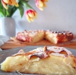 Jabolka olupite in jih na tanko narežite z mandolino (rezalnikom). Preložite jih v skledo, prelijte z limoninim sokom in postavite na stran. Testo pripravite tako, da najprej stepete jajca s sladkorjem, nato pa dodate naribano limonino lupinico in sol.