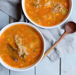Nasitna zelenjavna juha, polna zelišč, je kot nalašč za slovo od poletja. Za posebno zadoščenje poskrbijo veliki žličniki iz pirine moke.