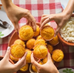 2 jajci 1 skodelica (približno 2 decilitra) koruzne moke ali koruznega zdroba (polente) 1 skodelica bele moke 1 skodelica jogurta ½ skodelice olja ½ skodelice vode (navadne ali gazirane) 1 zavitek pecilnega praška ½ zravnane žličke soli 300 gramov naribanega sira