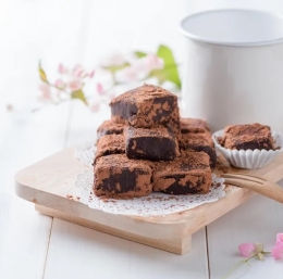Ko se kolač ohladi, odstranite papir. Segrejte nož in z njim poravnajte robove kolača, da dobite lepo obliko. Nato ga narežite na približno 2,5 cm velike kocke. Pred vsakim rezanjem nož ponovno segrejte. Na koncu s pomočjo cedila posujte kakav preko narezanih kock.