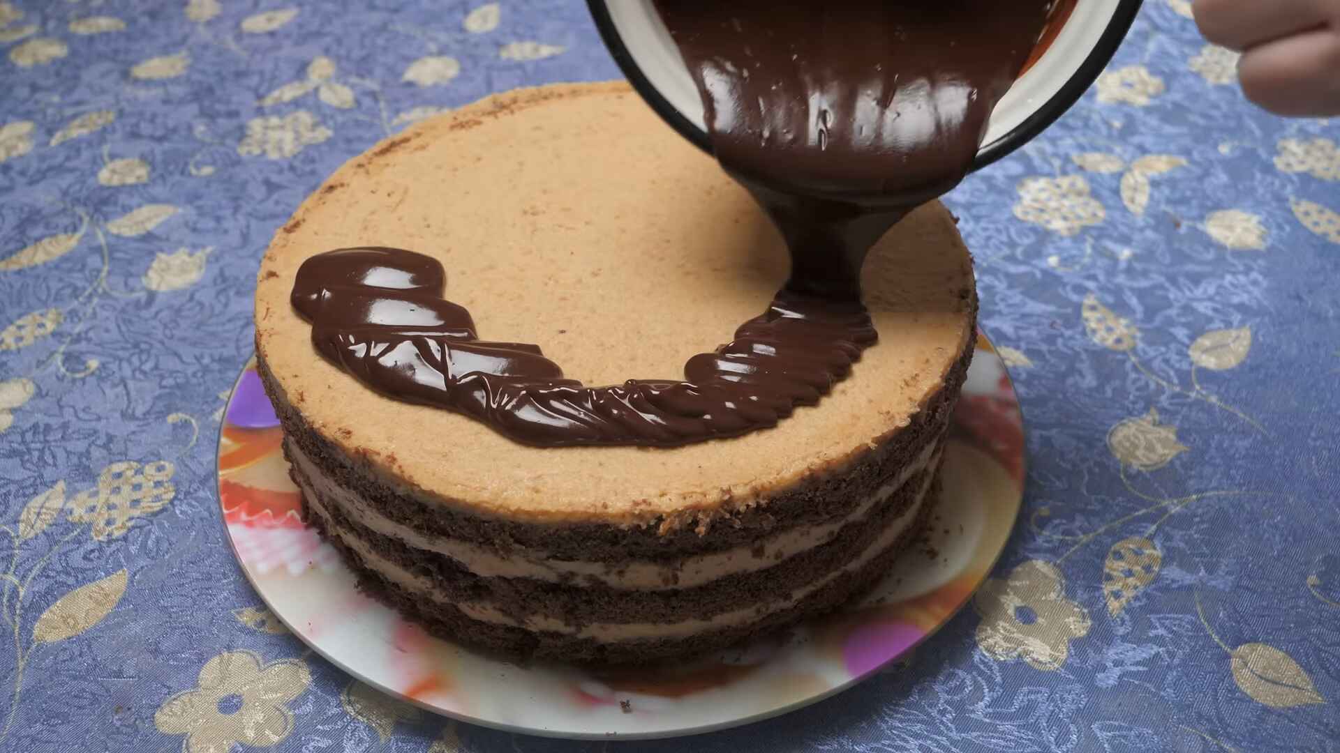 Prelijemo z glazuro, ki jo pripravimo tako, da na pari stopimo čokolado in sladko smetano.