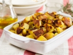 Vse skupaj porinite v pečico in pecite 20 minut, oziroma, dokler krompir ni zlato zapečen. Počakate 5 minut, da se okusi povežejo, in postrežete.