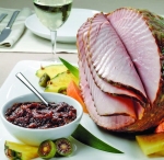 Ko je šunka pečena, jo zavijemo v folijo in počakamo 15 minut. še enkrat jo premažemo z omako in narežemo. Postrežemo s preostalo omako.