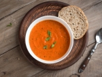 1. Paprike pečemo 15 minut v pečici pri 250 stopinjah, da koža počrni. V pokriti posodi jih ohladimo do mlačnega, olupimo in odstranimo semena. Sok, ki je nastal pri peki, precedimo in uporabimo v juhi.
