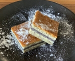 10 jajc 300 g sladkorja 250 g stopljenega masla 100 g stopljene bele čokolade 1 l mleka 200 g mletega maka 10 žlic (zvrhanih) gladke moke maslo in mleti mak za pekač sladkor v prahu za posip