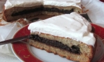 2 Vmes zmešajte sestavine za nadev. Nadev naj bo tako gost kot za potico. Nadev previdno porazdelite po pravkar pečeni polovici biskvita in ga prelijte z drugo polovico mase za biskvit. Pekač položite nazaj v pečico in pecite še 45 minut.