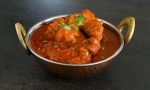 3 Po mariniranju, na olju prepražimo čebulo, da prijetno zadiši in dodamo česnovo pasto, ki jo pražimo 2-3 minute. Dodamo meso in ga z vseh strani enakomerno popečemo. Dodamo paradižnikovo mezgo, jušno kocko in marinado, ki je ostala. Prelijemo z vodo, da prekrije piščanca in kuhamo toliko časa, da se polovico omake pokuha in izpari.
