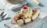 4 Pripravimo si štiri podolgovate skledice, v katerih bomo postregli sladico. Med dve polovici banane položimo po tri kepice sladoleda (po eno kepico vsakega okusa), prelijemo s stopljeno čokolado, okrasimo s stepeno sladko smetano in potresemo s popraženimi lešniki.