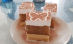 Še vročo zmes prelijemo na pečen biskvit in dobro ohladimo. Ohlajeno pecivo okrasimo po želji, lahko samo s smetano – kot na sliki.