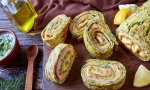 Testo vzamemo iz pečice in s peki papirjem vred preložimo na pult. Testo obložimo s kuhanim pršutom in sirom ter zavijemo v rolado. Trdno zavijemo s peki papirjem, da se nam ne odvije in pustimo, da se ohladi.
