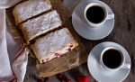 S pomočjo prta testo zavijamo, začnemo na tistem koncu, kjer so nadevane brusnice. Na koncu ga prestavimo na peki papir in sicer tako, da je spoj na dnu. Naš štrudelj s papirjem postavimo na pekač. Dobro ga premažemo s stopljenim maslom.
