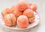 Pripravimo si tri sklede. V prvi skledi z vodo zmešamo rumeno barvilo, v drugi rdečo barvilo, v tretjo pa damo sladkor. Breskvice najprej namočimo v rumeno barvilo, nato v rdečo. Pustimo, da se odcedijo, potem pa jih povaljamo v sladkorju.
